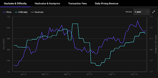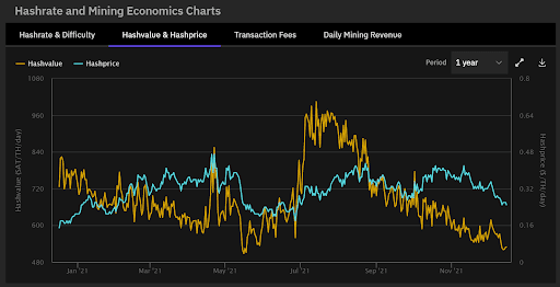 Another example of this can be found in the chart above which shows BTC price and difficulty throughout 2021. You may ask, why didn’t hashprice double when hashvalue doubled in July? Despite the significant decrease in difficulty, the price of BTC also happened to drop by nearly 50% around the same time.